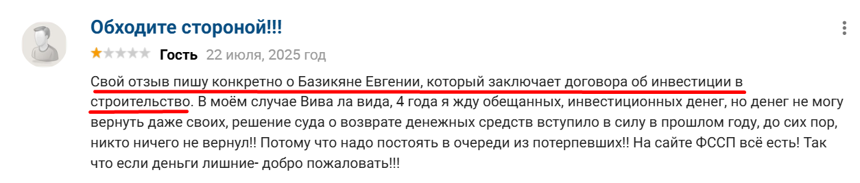 Основатель мутной схемы в сфере недвижимости Евгений Базикян также стал звездой жалоб обманутых вкладчиков и покупателей. Пользователи указывают на заключение с инвесторами сомнительных договоров без срока завершения проекта и возврата инвестиций. Также составляют договора перепродажи доли в ИЖС с физлицом, по факту продавая здания под снос. Начиная строительство проекта, фирма самовольно увеличивает площадь и не завершает работу.