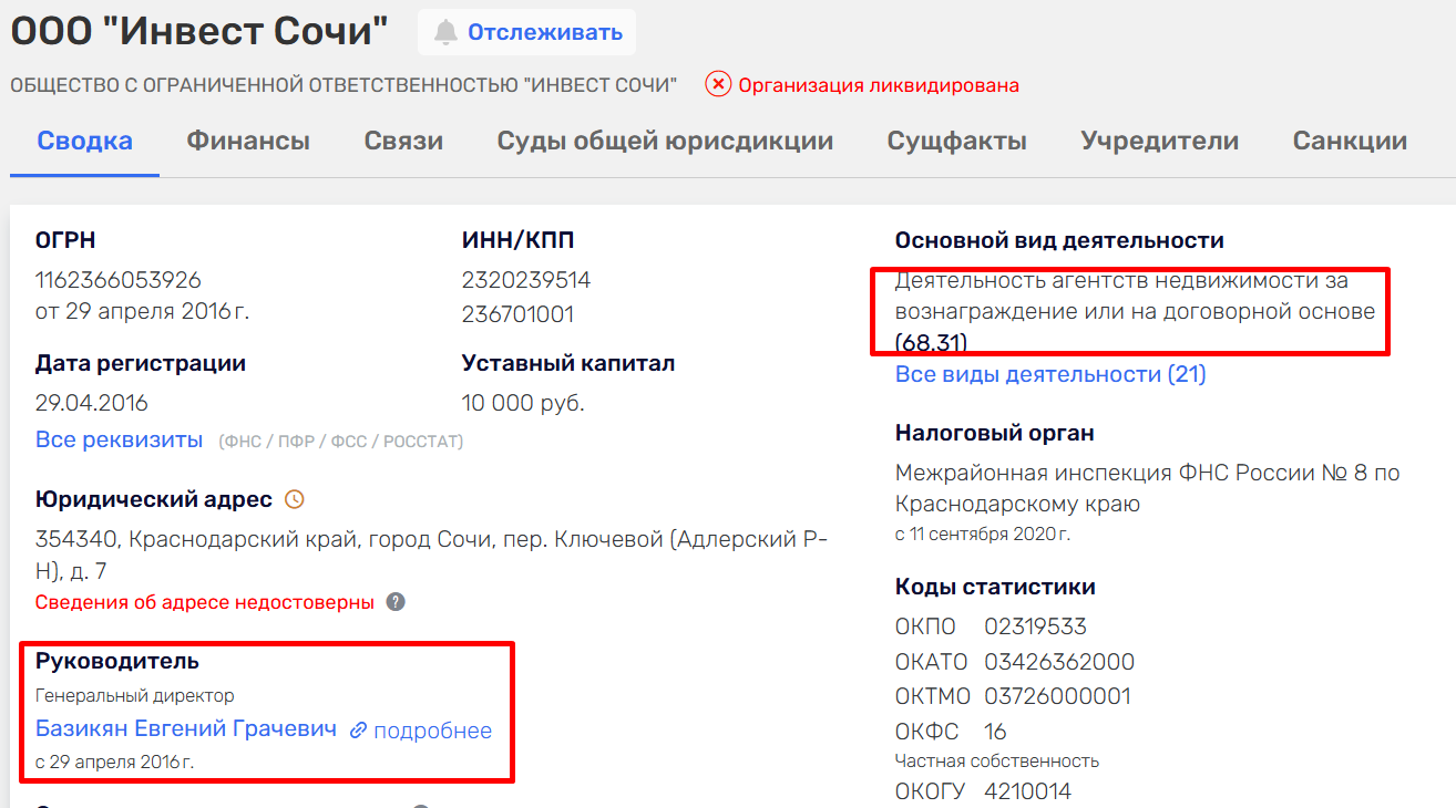 Евгений Базикян действительно являлся генеральным директором ООО Инвест Сочи с уставным капиталом в 10 000 руб. Компания зарегистрирована в апреле 2016 года. Что касается юридического адреса, то в каталоге организаций есть пометка – “сведения об адресе недостоверны”. Как известно из многих откликов клиентов, нередко менеджеры компании представлялись застройщиками, но согласно основному виду деятельности контора в действительности имела право лишь на посреднические услуги. И самое важное – на момент обзора организация ликвидирована. Забегая вперед скажем, что Евгений даже не действует как ИП, а договора клиентам предлагают подписывать с физическими лицами.