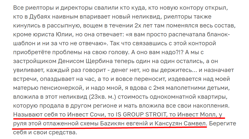 - негативные отзывы про Инвест Сочи и руководителя проекта Евгения Базикяна;