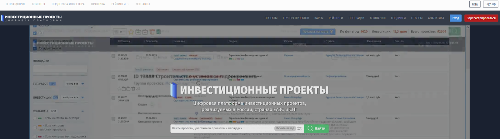 Инвестиционные Проекты России | Цифровая Платформа – аналитическое агентство ПКР, входящее в ТОП-5 аналитиков России и в ТОП-100 ведущих консалтинговых компаний. Это удобная в работе цифровая платформа, используемая в качестве инструмента аналитики активности инвестиций, ведения проектных продаж на территории РФ. На площадке ПКР Investprojects собраны проекты в различных сферах деятельности.