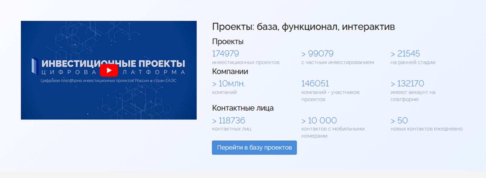 На сервисе Investprojects можно увидеть информацию по компаниям из 9 стран СНГ, включая Армению, Казахстан и другие. На встроенной карте показано расположение компании. Доступны фильтры по регионам, отраслям или стадии реализации. Для каждого проекта формируется собственная информационная карточка. Среди функций – отраслевая аналитика. Это обзоры по реализованным инвестиционным проектам, участникам рынка. Доступен детальный разбор и аналитика по отдельным объектам.