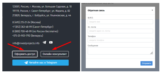 Для доступа ко всем функциям площадки нужен доступ. Но как получить и сколько стоит лицензия на investprojects info неизвестно. Скорее всего, информацию можно получить, отправив заявку на оформление доступа к платформе. Для этого нужно в нижней части главной страницы сайта перейти к запросу, оставив контакты для связи. Тут же можно получить бесплатную консультацию через онлайн чат. А что вы думаете о сервисе Investprojects Info? Поделитесь комментариями.