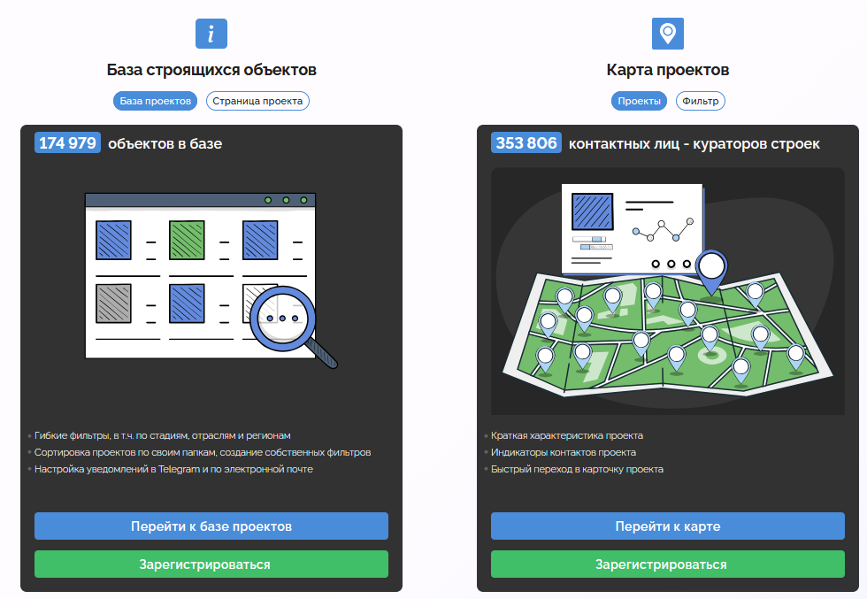 - удобная в работе карта проектов с краткими характеристиками, быстрыми переходами на карточки объектов, индикаторами;