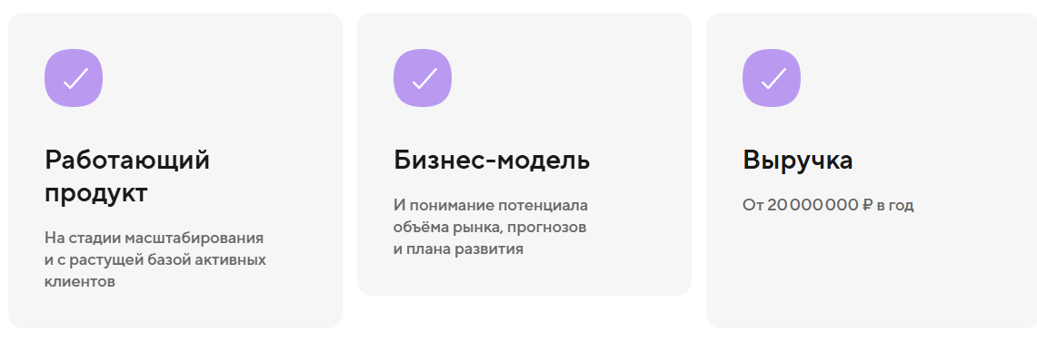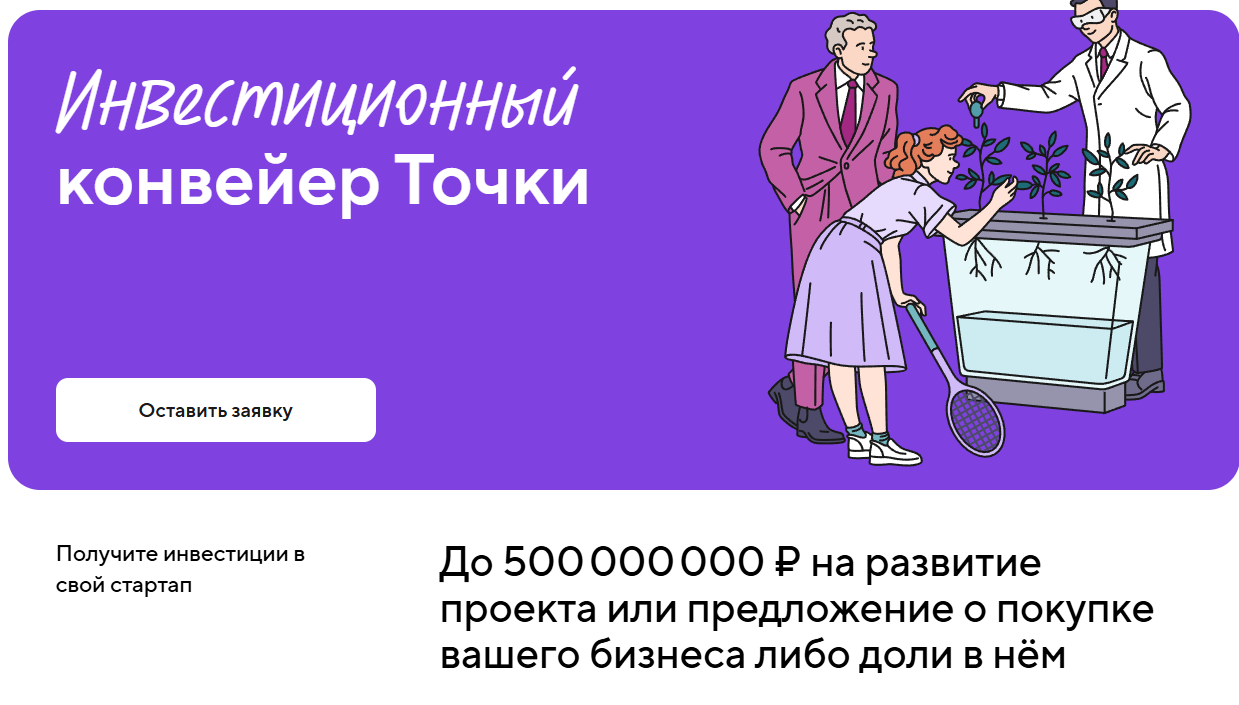 Самое интересное – это требования к предприятиям, ведь далеко не вовсе Инвестиционный конвейер Точки готов вкладывать деньги. Во-первых, продукт должен быть уже работающий, причем еще и активно развивающийся. Во-вторых, нужно иметь полноценный план и бизнес-модель. В-третьих, компания уже обладать выручкой более 20 млн р. в год.