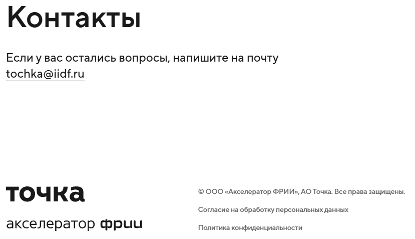 Связаться с представителями компании можно только через электронную почту, что довольно подозрительно: обычно предоставляют как минимум два контакта. Тем не менее организация имеет официальную регистрацию и значится в реестрах как ООО Акселератор ФРИИ.