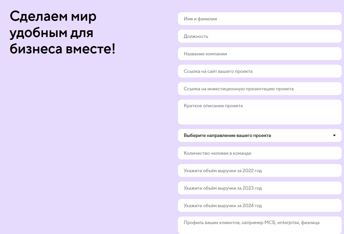 Заявку же можно оставить прямо на сайте. Тут указываем имя, фамилию, должность, заполняем сведения о компании, в том числе объемы выручки. В конце оставляем контакты для связи.