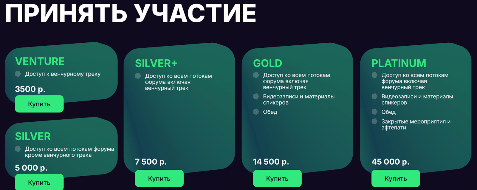 На сайте проекта опубликованы цены на участие в конференции. Варьируются они в зависимости от категории билета и стартуют от скромных 3500 рублей. К слову, данный билет является базовым и никаких привилегий не дает. Чтобы получить доступ к каждому треку ивента и венчуру, придется выложить на 4000 рублей больше. Самый премиальный «платиновый» билет обойдется уже в приличные 45 000 рублей: его обладатели попадают на все блоки, бизнес-банкет и закрытую вечеринку с афтепати.