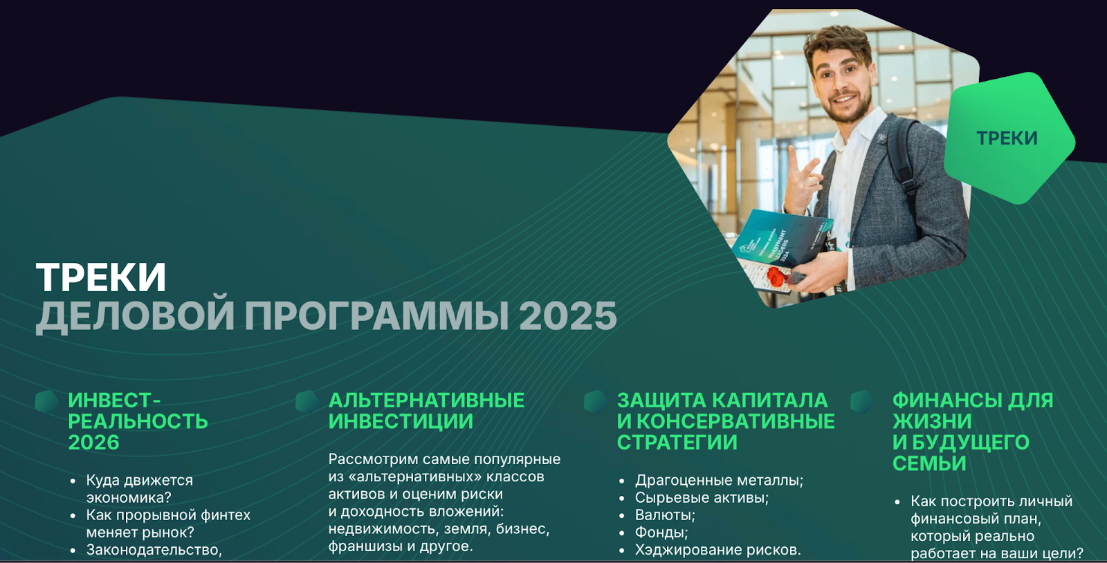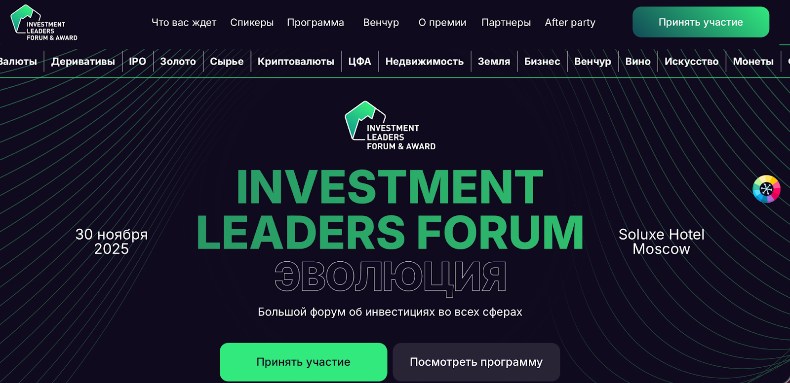 «Всё об инвестициях Investment Leaders 2025» — проект, в рамках которого выступают лидеры различных бизнес-секторов, стартаперы, инвесторы и прочие деятели финансового мира. Программа ивента делится на блоки согласно направлениями и специфике инвестирования.