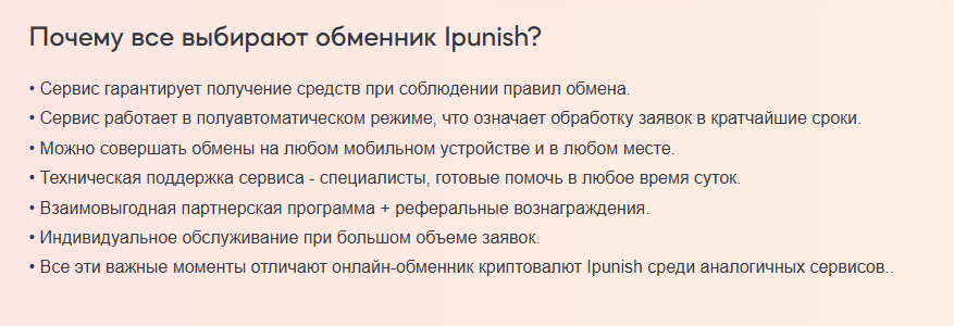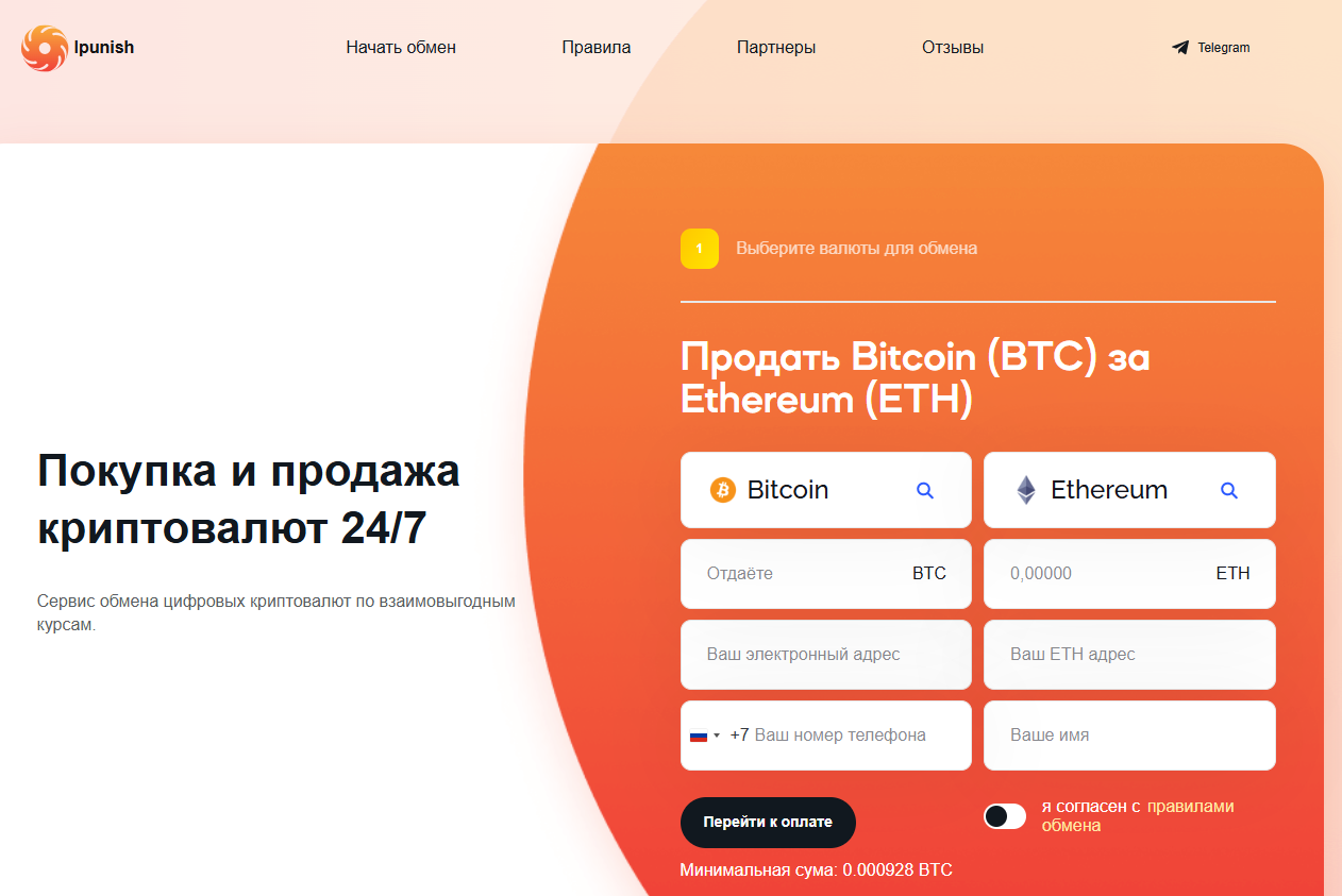 Ipunish — это сервис по обмену цифровых валют по выгодному курсу. Его услуги доступны на ipunish com. Обмены можно совершать круглые сутки. Поддерживаются биткоины, эфириумы, тезер и ряд других популярных токенов. Также можно обменять криптомонеты на рубли.