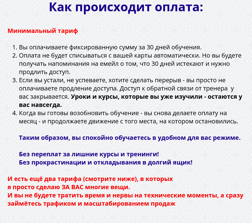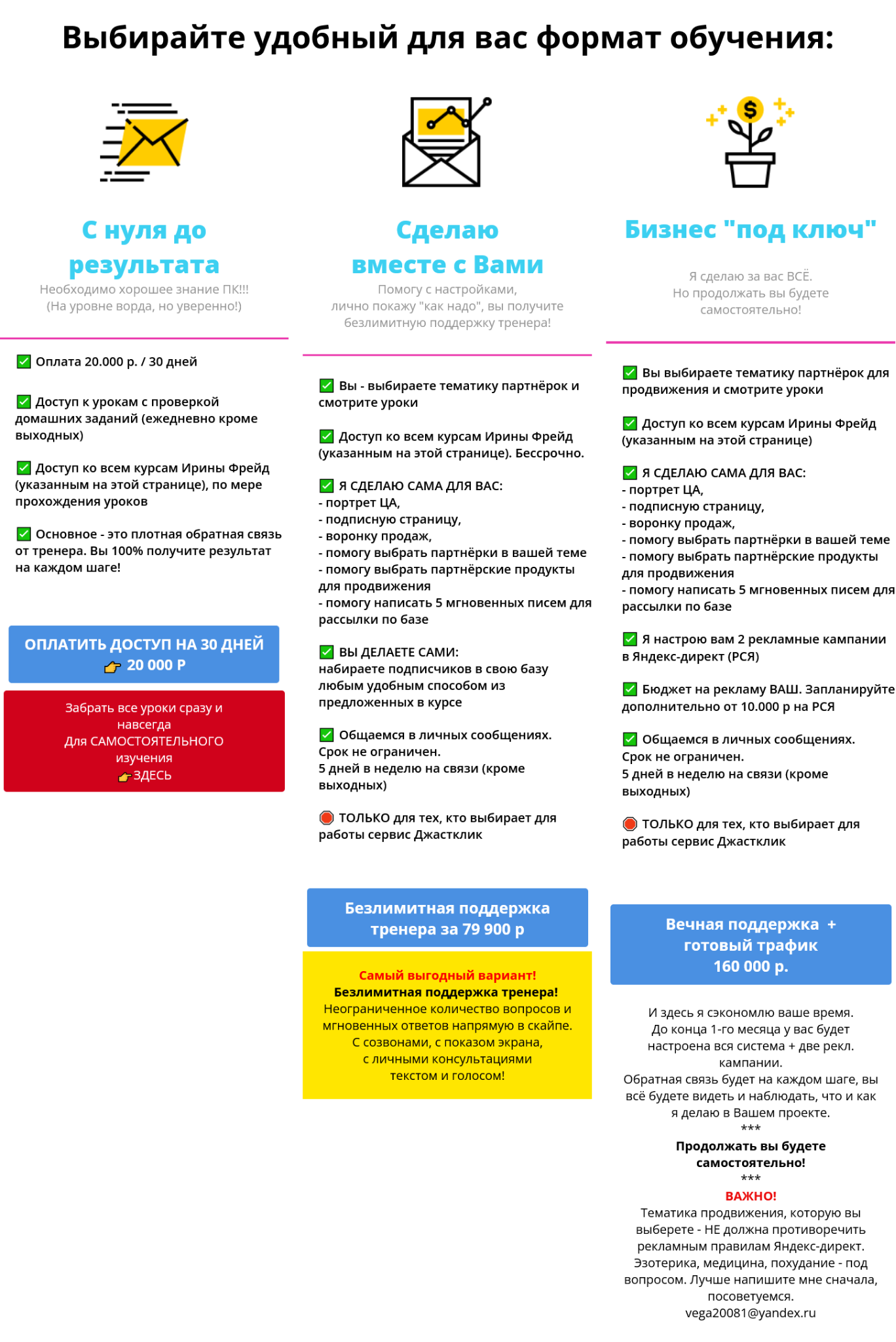 На сайте интернет-школы указано, что проходить обучение можно как самостоятельно, так и под руководством наставницы. Ирина Фрейд предлагает три тарифа: