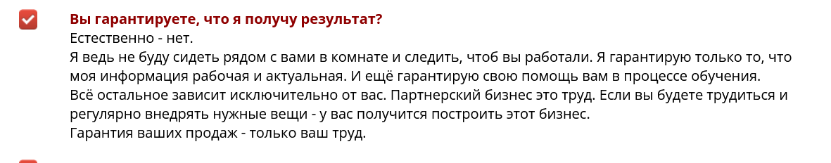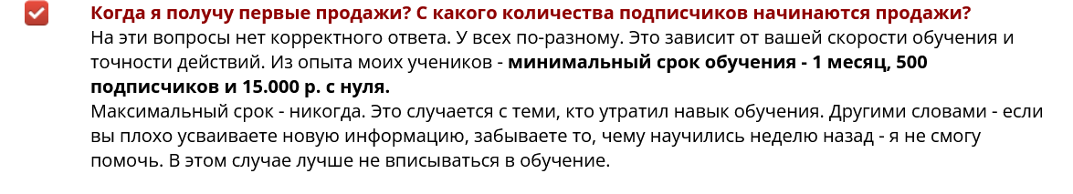 Наставница не гарантирует результат после обучения, но обещает, что дает ученикам полезную и актуальную информацию.