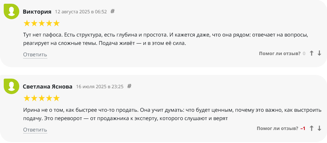 На сайте онлайн-школы отклики учеников отсутствуют. На сторонних ресурсах есть только положительные отзывы о курсах Ирины Фрейд. Люди пишут, что здесь нет пафоса, коуч учит думать, а не просто продавать.