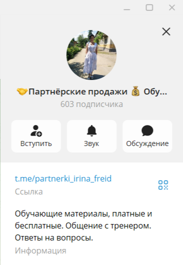 Коуч администрирует канал в Телеграмм, который называется «Партнерская программа. Обучение с нуля с Ириной Фрейд». На комьюнити в апреле 2026 года подписаны 603 человека.