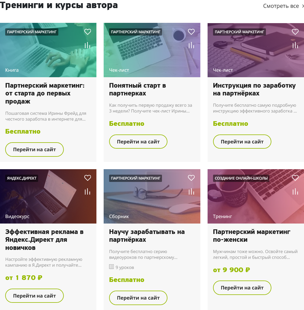 У Ирины Фрейд также есть и другие учебные гайды, часть из них можно получить бесплатно, некоторые приобрести за деньги. Например, за чек-лист «Понятный старт в партнерках» платить не нужно, а тренинг «Партнерский маркетинг по-женски» стоит от ₽9,900.