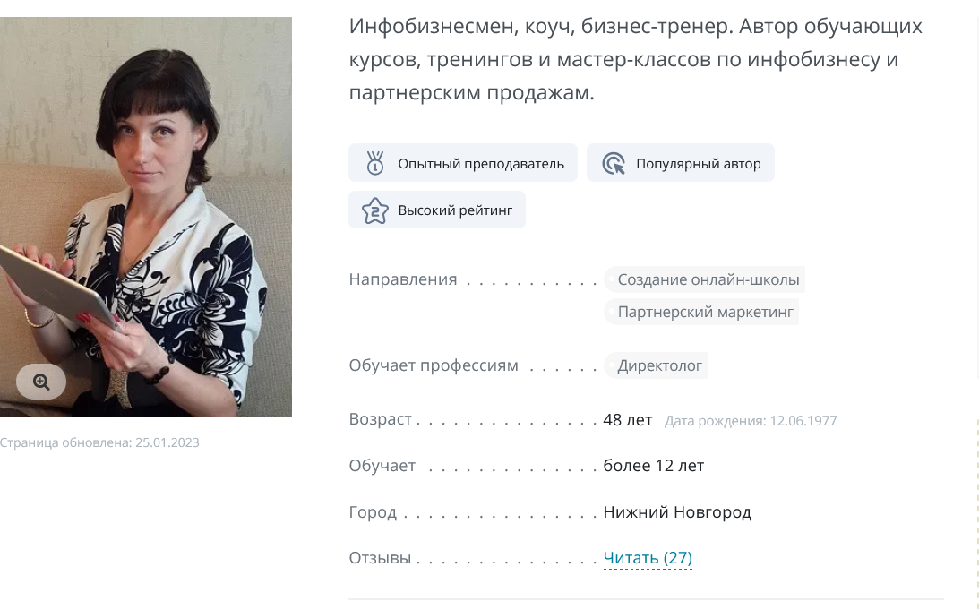 В ходе написания статьи были выявлены подозрительные моменты, которые позволяют предположить, что наставница обманывает людей. По этой причине мы не рекомендуем с ней сотрудничать и покупать у нее учебные гайды.