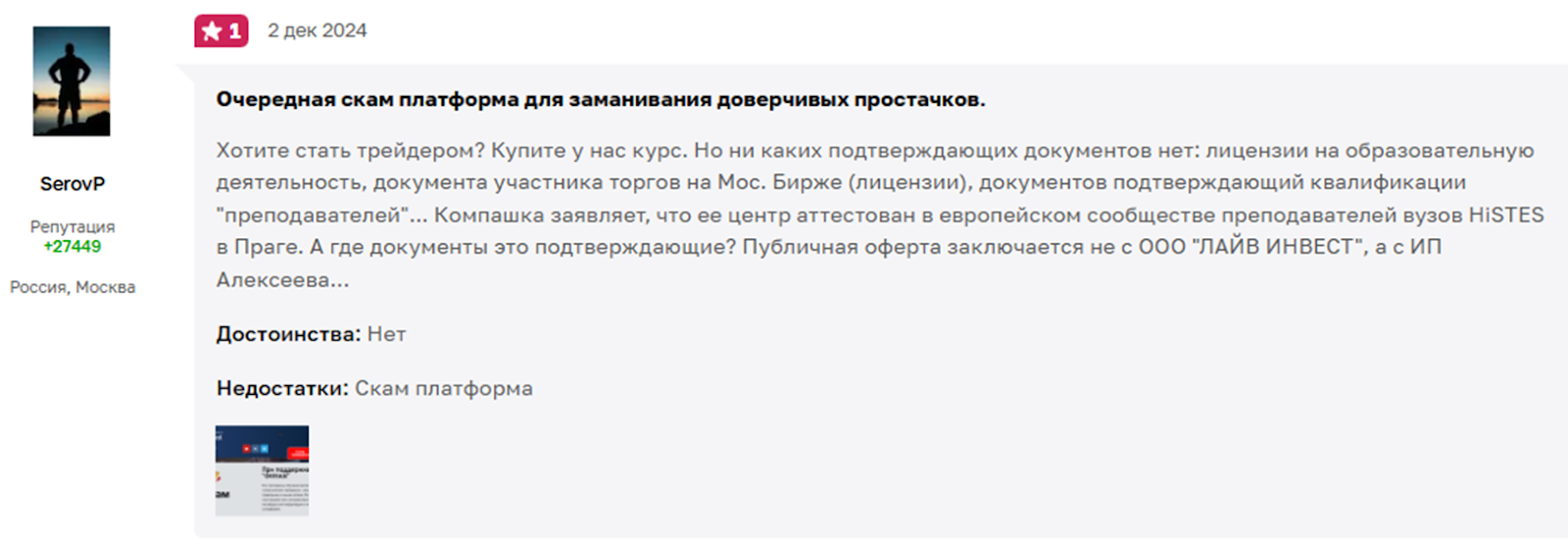 17 лет опыта? Да хоть 70 без доказательств это просто цифра. 😤 Курсы, школа, обещания всё как по шаблону Мы научим, вы заработаете! Только ученики потом учат других как не попадаться на такие школы. Отзывы в стиле развод, всё впустую, денег не вернули! Если это и есть Live School, то учат там, как ожить после того, как с тебя сняли последние деньги.