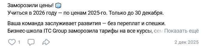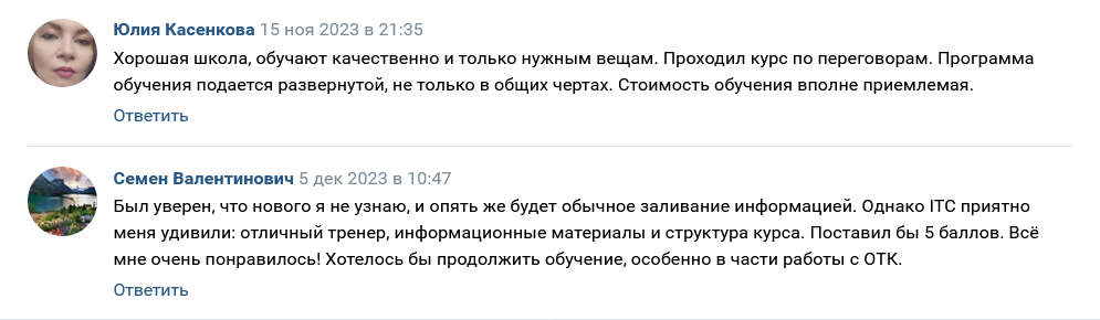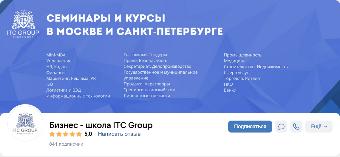 Также здесь есть отзывы о ItcTraining, оформленные в формате видео. У бизнес-школы есть группа в ВК, на которую в феврале 2026 года подписаны 841 человек. Здесь публикуются актуальные цены на обучение, информация о проводимых акциях.