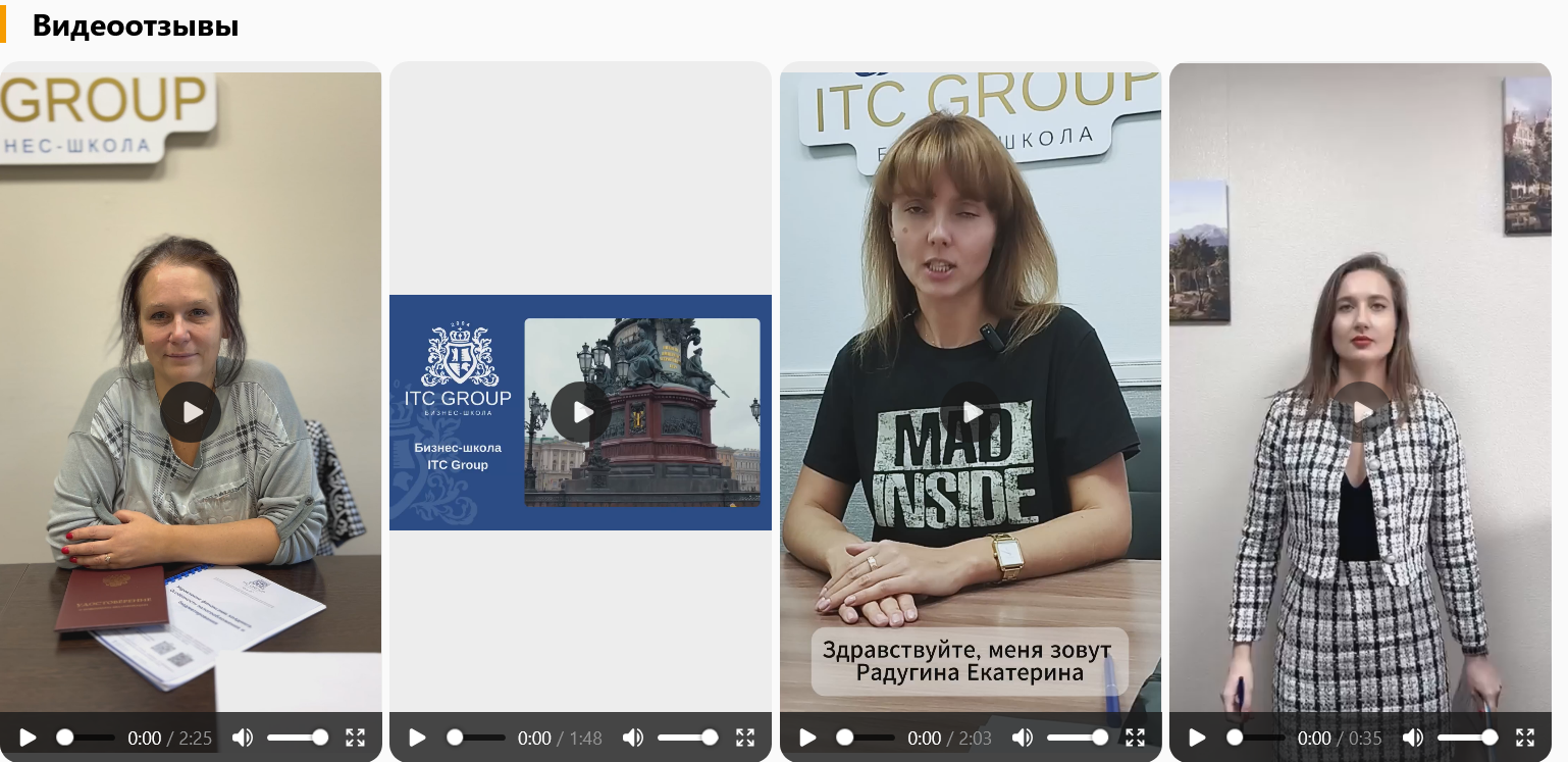 На канале в Дзен нет ни реакции, ни комментариев. На сайте размещены хвалебные отзывы о бизнес-школе Itc Group в формате видео. Ученики благодарят основателей онлайн-академии за учебу и доступные материалы.