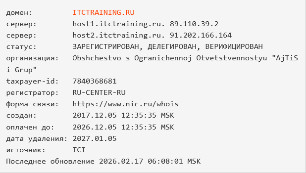 Сайт интернет-академии, по данным проверки домена itctraining ru, начал работать в 2017 году, оплата действительна до конца 2026 года.