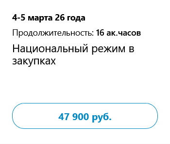 Цена курса зависит от выбранного направления и продолжительности обучения. Например, участие в семинаре по теме «Национальный режим в закупках» стоит ₽49,700.