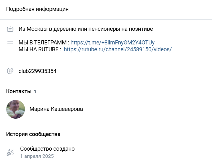 Во Вконтакте группа работает с 1 апреля. Там же есть ссылки на Рутуб и телеграмм-канал, а также страницу самой Кашеверовой в соцсети.
