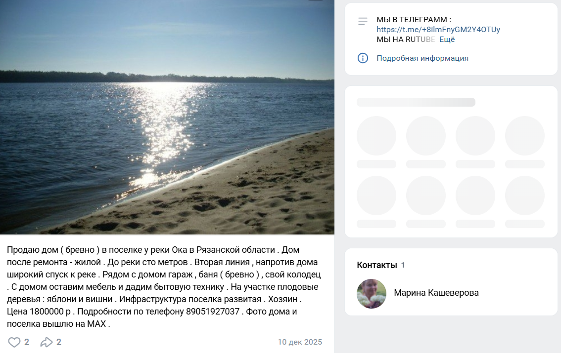 В своих группах, например во Вконтакте, авторы также постят рекламу продажи домов в сельской местности, например в Рязанской области. Покупка деревенского дома с садом, гаражом и баней обойдется в ₽1,800,000.