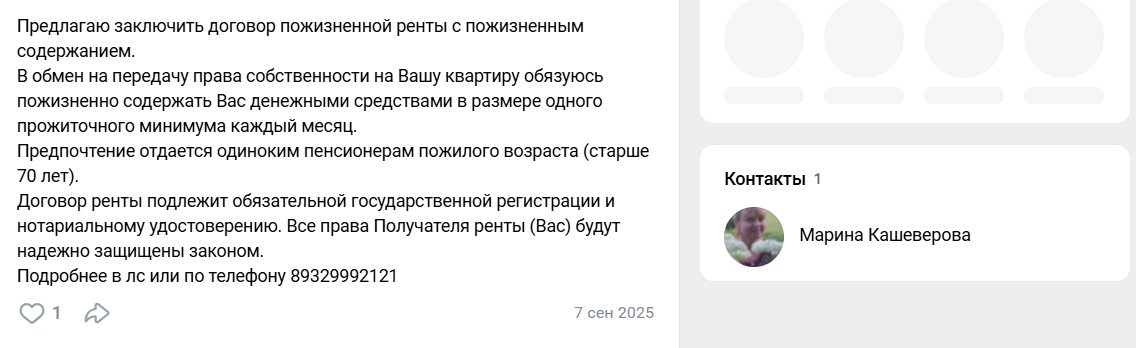 - В группах проекта рекламируются недвижимость в деревне и предложения по передаче прав на квартиры в обмен на пожизненное содержание, т.е., Кашеверовы могут предлагать сомнительные сделки.