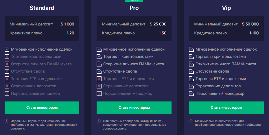 - Pro – минимальный депозит $25,000, кредитное плечо 1:50, добавляется торговля криптовалютами, открытие личного ПАММ-счета и отсутствие свопа;