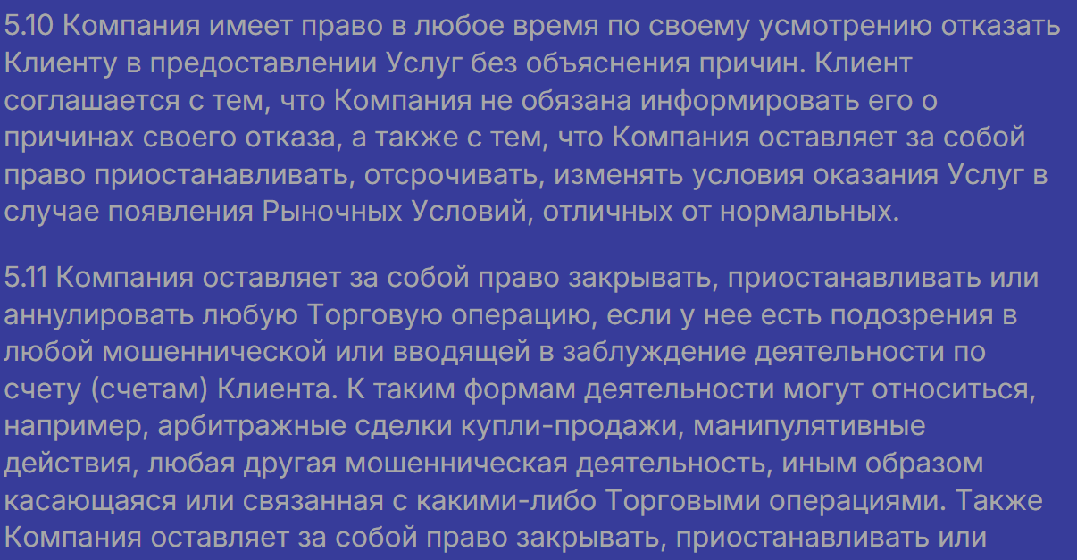 - соглашение снимает с компании ответственность за любые убытки и позволяет заблокировать счет без объяснений, поэтому вывести деньги при желании компании удержать их будет практически невозможно;