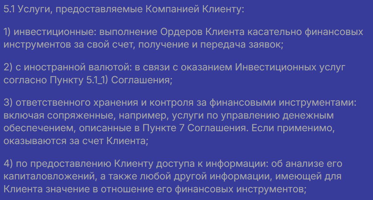 Отдельный пункт описывает услугу «легализации прибыли»: помощь в открытии счета в зарубежном банке и регистрации оффшорной компании. Для легального брокера, который торгует на регулируемых рынках, такие услуги нехарактерны.