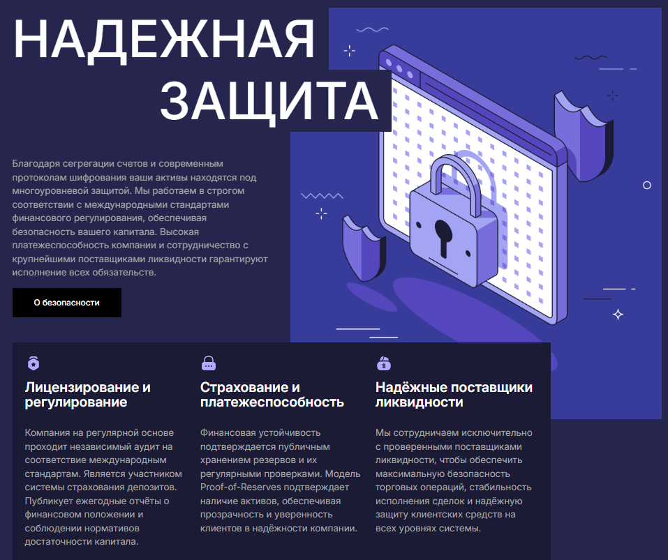 Главная страница содержала стандартный набор заявлений: институциональный уровень безопасности, прямой выход на мировую ликвидность, торговля без задержек. Конкретных данных о компании, реквизитов или публичной истории аудита на сайте не было.