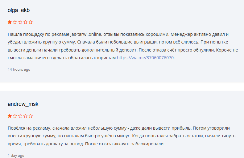 Отзывы о JasTarwi в сети только негативные. Клиенты описывают схожую последовательность: небольшой стартовый депозит приносит видимую прибыль, после чего менеджер убеждает внести крупную сумму, обещая заработать значительно больше. При попытке вывести деньги система выдвигает дополнительные требования – доплатить комиссию, пополнить до минимального порога или пройти повторную верификацию. После отказа выполнять эти условия аккаунт блокируется.