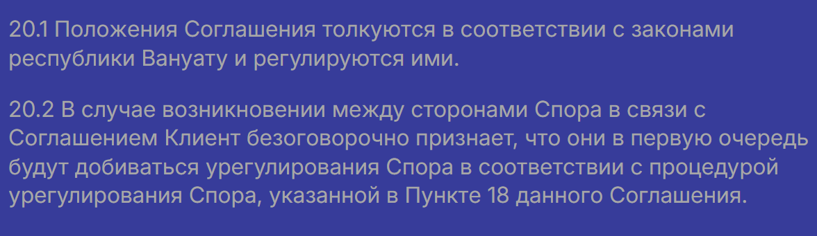 Все споры рассматриваются исключительно по законодательству Вануату – это оффшорная юрисдикция с минимальным уровнем защиты клиентов финансовых компаний.