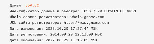 Никаких данных об основателях проекта, дате и месте регистрации компании нет. Проведя проверку с помощью сервиса Whois стало ясно, что сайт инвестиционной платформы был создан в августе 2014 года, а в октябре 2025 доменное имя jsa cc обновили.