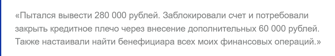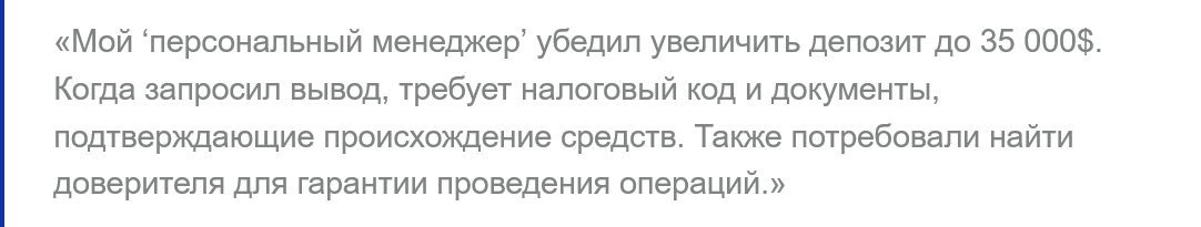 Также клиенты рассказывают, что пытались вывести ₽280,000, однако потребовалось закрыть кредитное плечо взносом в ₽60,000, а потом менеджеры потребовали найти бенефициара, после чего аккаунт был заблокирован.