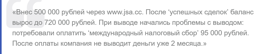Так как социальных сетей у платформы нет, стоит изучить сторонние площадки, где есть только отрицательные отзывы о jsa cc. Люди пишут, что вносят на баланс ₽500,000, баланс счета уверенно растет до ₽720,000. После создания заявки на вывод, менеджеры просят заплатить международный сбор в размере ₽95,000, однако прибыль все равно не выводят.