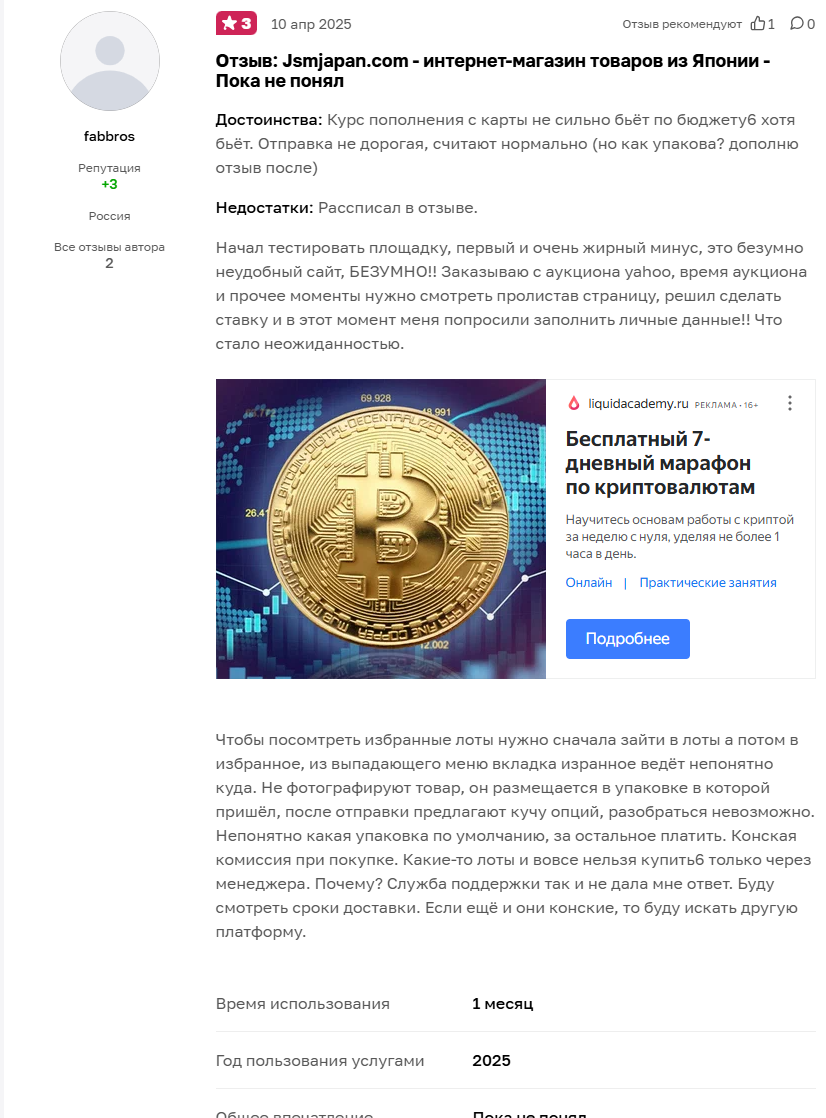 На независимых платформах представлены негативные отзывы о JsmJapan com. Пользователи делятся опытом использования сайта и тг-группы для покупки и доставки товаров из Японии. Один из деятелей из России начал тестировать платформу и сразу отметил основной недостаток в виде неудобного сайта. Для просмотра времени аукциона или деталей лота требуется пролистывать длинные страницы. При попытке сделать ставку неожиданно запрашиваются личные данные без предварительного предупреждения.
