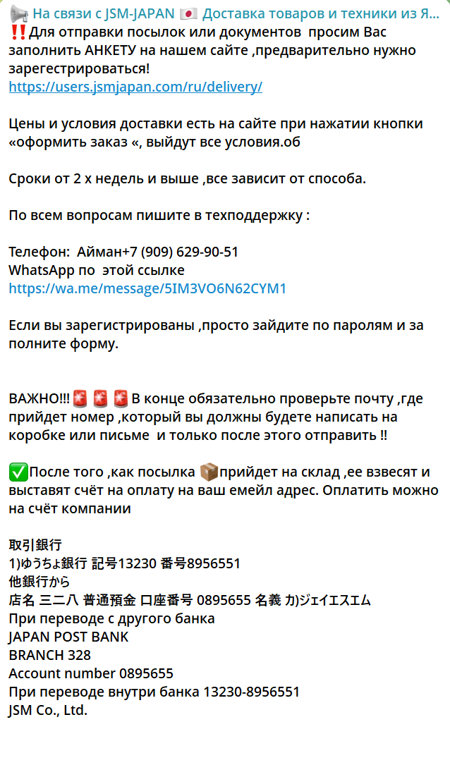 Компания также использует тг-канал jsm japan для публикаций обновлений и общения. Также представлены ссылки на WhatsApp для русскоязычных клиентов. В Instagram, YouTube и TikTok организация размещает контент о товарах. Важно отметить, что банковские переводы подтверждаются редко, а криптокошелек менялся в 2024 году без уведомления всех клиентов. Это приводило к ошибкам в оплатах.