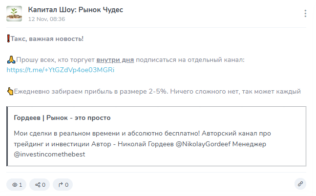 Отдельный блок контента занимает реклама. Канал продвигает сторонние проекты трейдеров и каналы с обещаниями ежедневной прибыли 2-5%. Такие посты являются основным источником дохода трейдера.