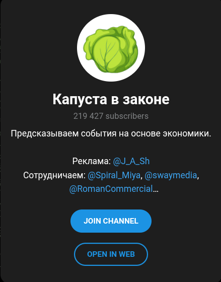 Канал «Капуста в законе» обещает предсказания на основе экономики, но на деле просто перепечатывает новости и рекламирует сомнительные проекты. Никакой пользы, только пустая трата времени.