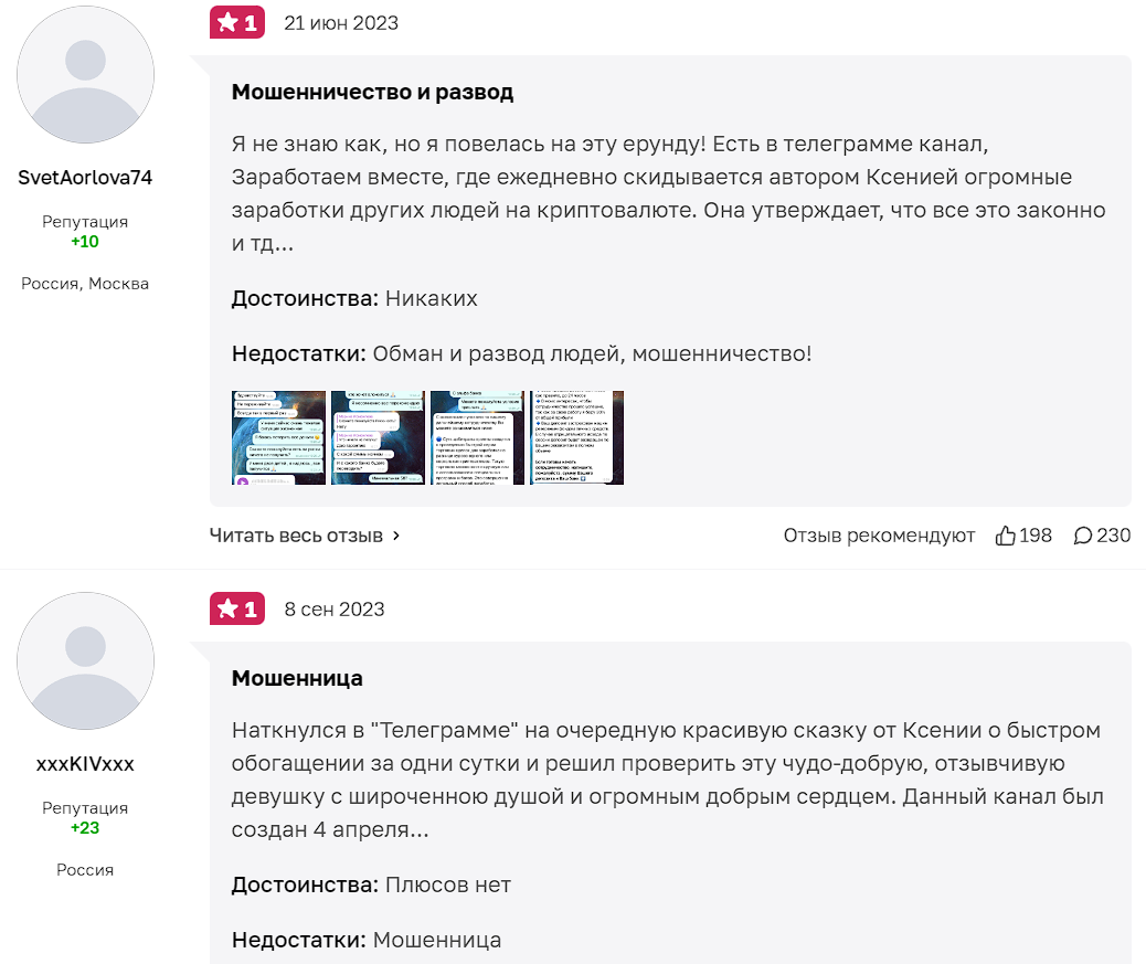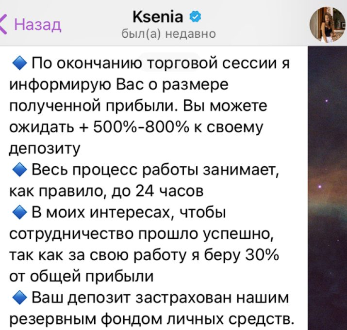 Последний такой пост поступил от некой Ксении, которая гарантирует приумножение депозита до 800%. За это она берет 30% от общей прибыли, а капиталы застрахованы якобы резервным фондом. Однако по итогу, когда пользователь захочет вывести деньги, менеджеры придумают услугу, которую надо оплатить и так до тех пор, пока у подписчика не будет нуля.