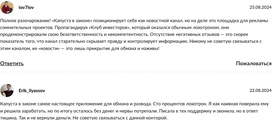 Этот канал «Капуста в законе» — просто сборище мошенников, которые за деньги рекламируют любые сомнительные проекты. После их рекламы «Клуба инвесторов» многие потеряли деньги, а они просто удалили пост и продолжают в том же духе. Доверять им — себя не уважать.
