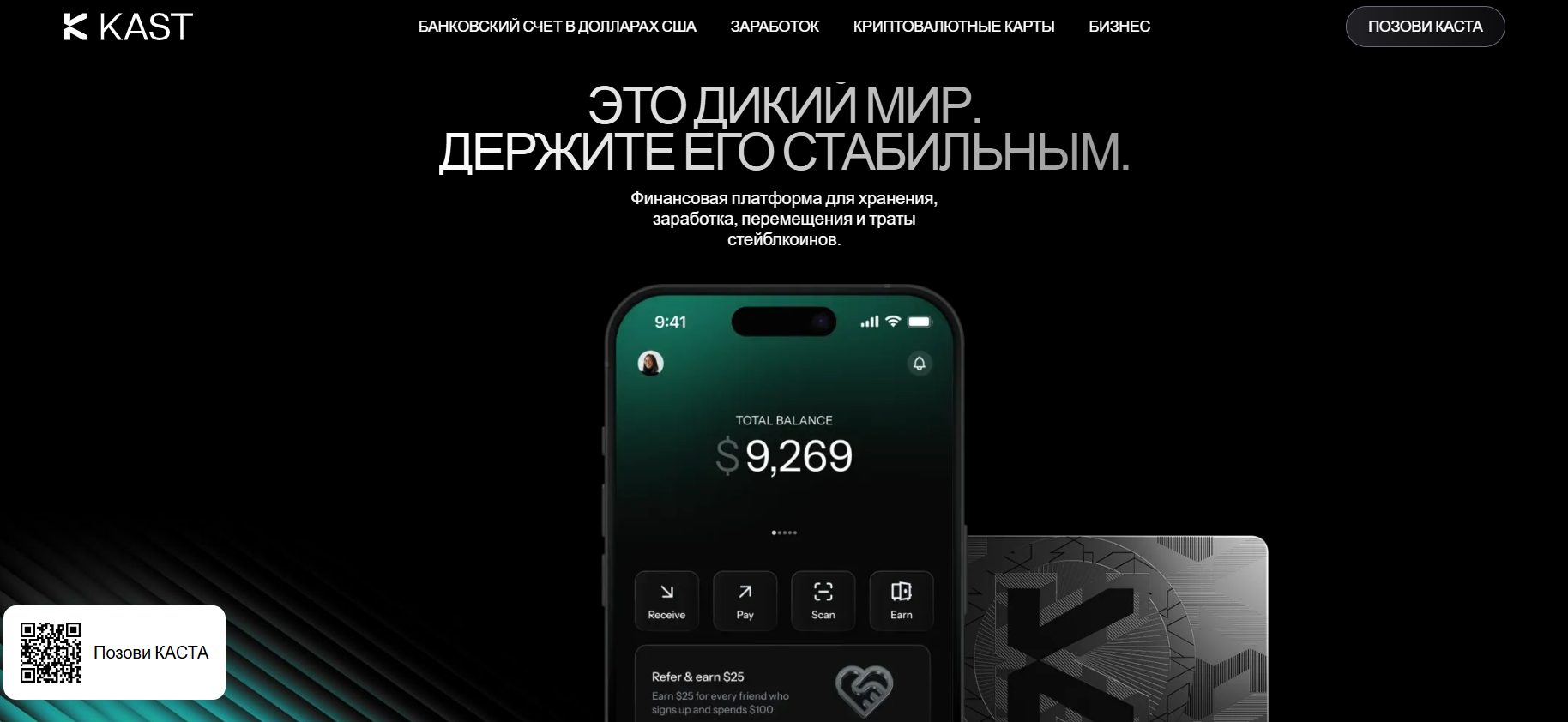 Kast Bank l называет себя финансовой платформой для хранения, перемещения, траты и заработка стейблкоинов. Сервис обещает пользователям, что с одного аккаунта на платформе он сможет не только распоряжаться своими средствами на счету, но и зарабатывать до 10% годовых. То есть клиентам доступно не только традиционное использование карты и счета, но и инвестиционные возможности. Также карта позволяет совершать любые переводы или оплачивать любые покупки по всему миру.