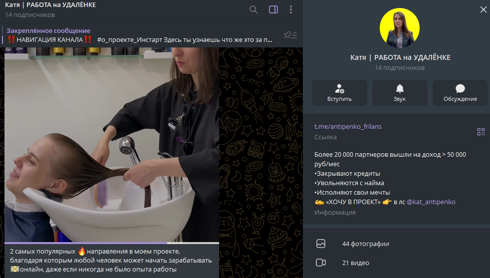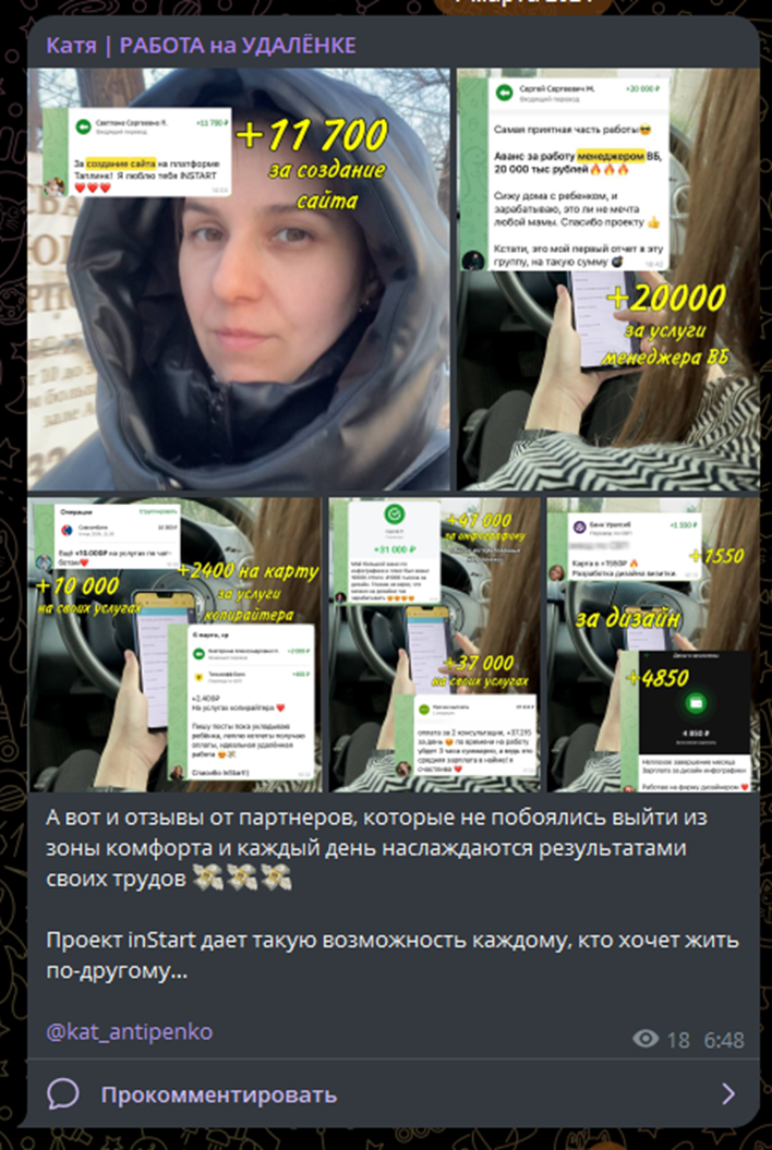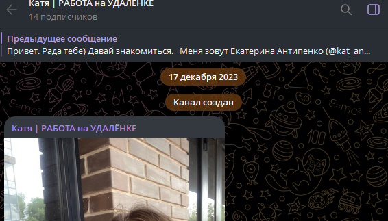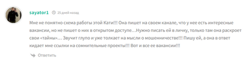 Катя Работа на удалёнке – проект по заработку из дома для всех желающих. Автор канала предлагает доход от 50 тысяч рублей на выполнении простых заданий. Но отзывы на ТГК Катя Работа на Удалёнке говорят о том, что это сплошной развод. Никакой работы на канале не предлагают, только собирают деньги с доверчивых подписчиков. Кроме того, прослеживается связь с Академией Инстарт, репутация у которой очень плохая.