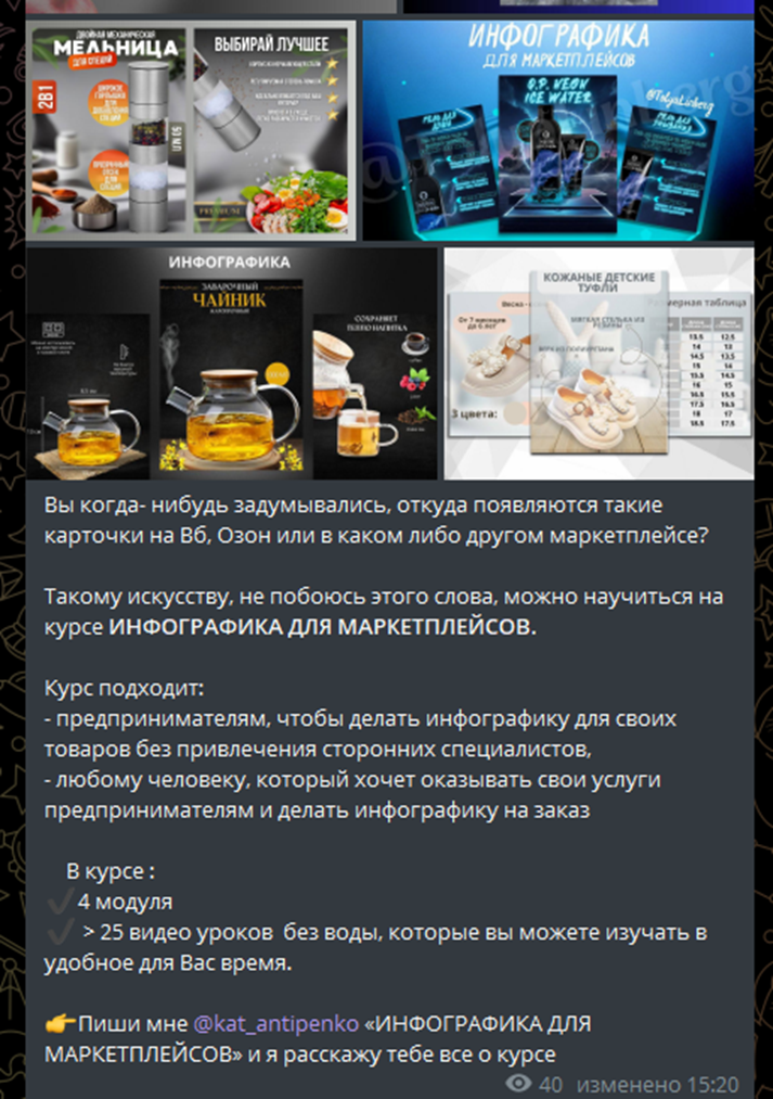 Практически весь контент – это реклама обучения. Девушка ничего не рассказывает о вакансиях. Она только обещает легкий доход на удаленке. Редкие посты посвящены ее работе – инфографике. Она предлагает курс обучения по этому направлению. Уточнить цену и условия можно, написав Кате в личку.