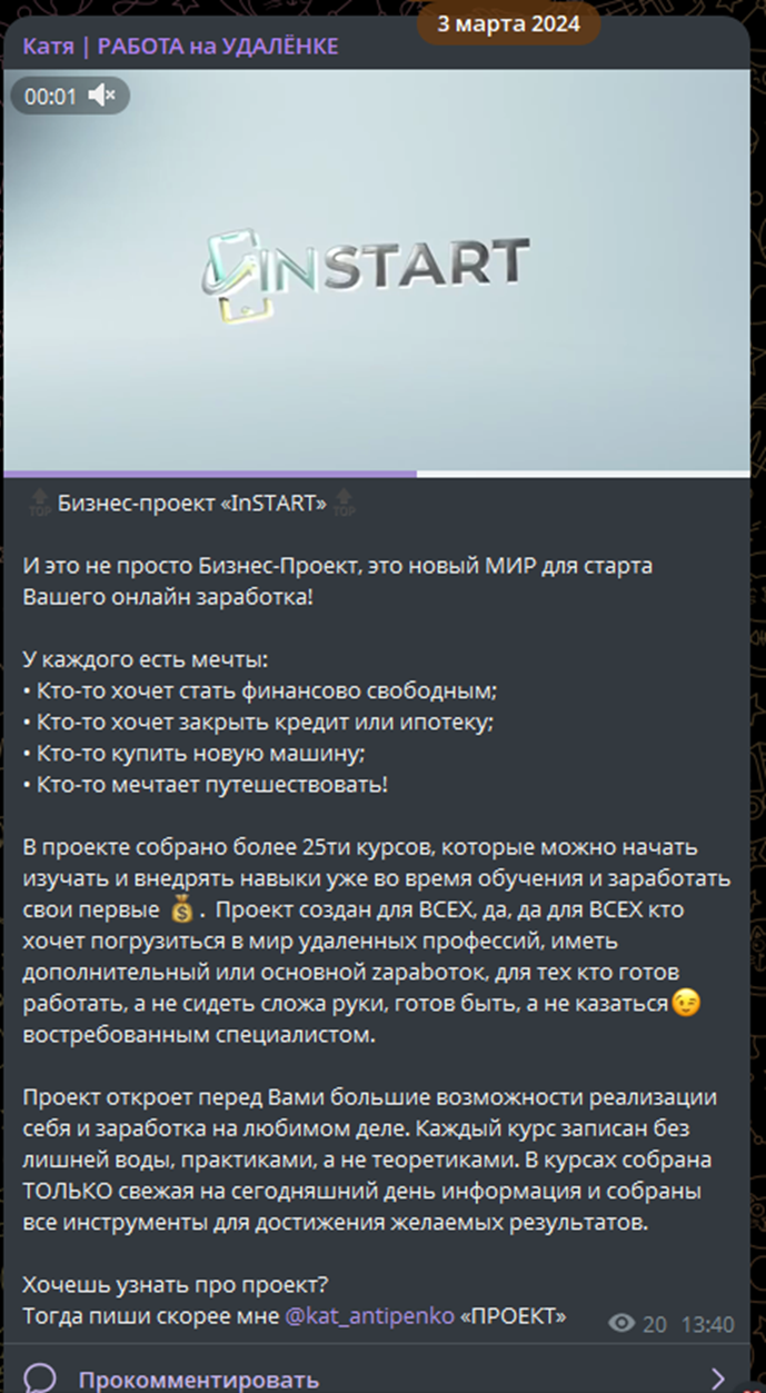 Телеграмм канал Работа на Удаленке – сомнительный проект, рекламирующий обучение по программам Инстарт. К признакам обмана подписчиков можно отнести: