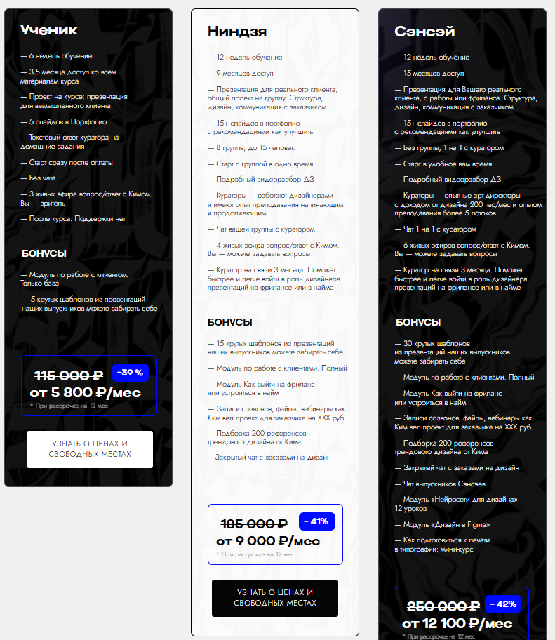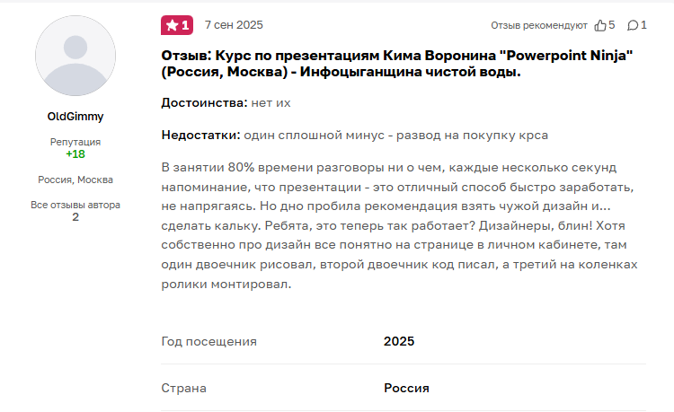 Обещания Кима Воронина о гарантированном заработке на его курсах по дизайну презентаций вызывают сомнения. Стоимость обучения начинается от 115 тысяч рублей, при этом в минимальном тарифе предлагаются лишь предзаписанные видеоуроки с минимальной обратной связью и практическими заданиями. Низкий интерес к его Telegram-каналу и неоднозначные отзывы ставят под вопрос эффективность и ценность предлагаемых программ.