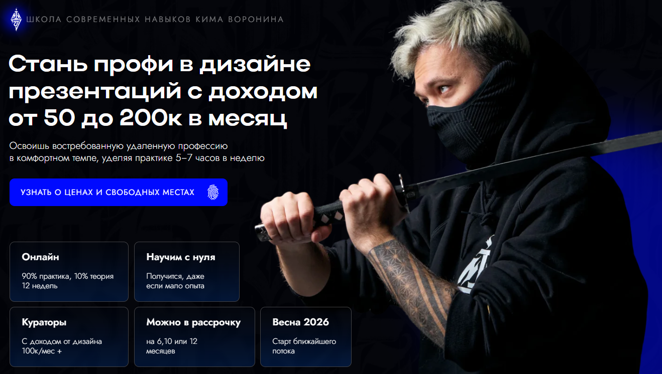 Обещания Кима Воронина о гарантированном заработке на его курсах по дизайну презентаций оказались пустыми. Стоимость обучения не соответствует качеству: минимальный тариф за 115 тысяч рублей предлагает лишь предзаписанные видеоуроки без обратной связи. Отзывы выглядят накрученными, а реальная польза от программы сомнительна. Разочарован таким подходом к обучению.