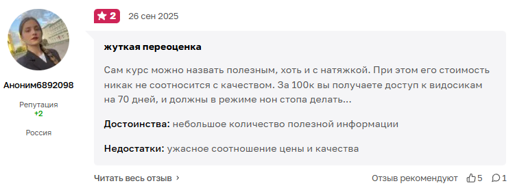 - неоднозначные отзывы об обучении, присутствует вероятность накрутки позитивных оценок;