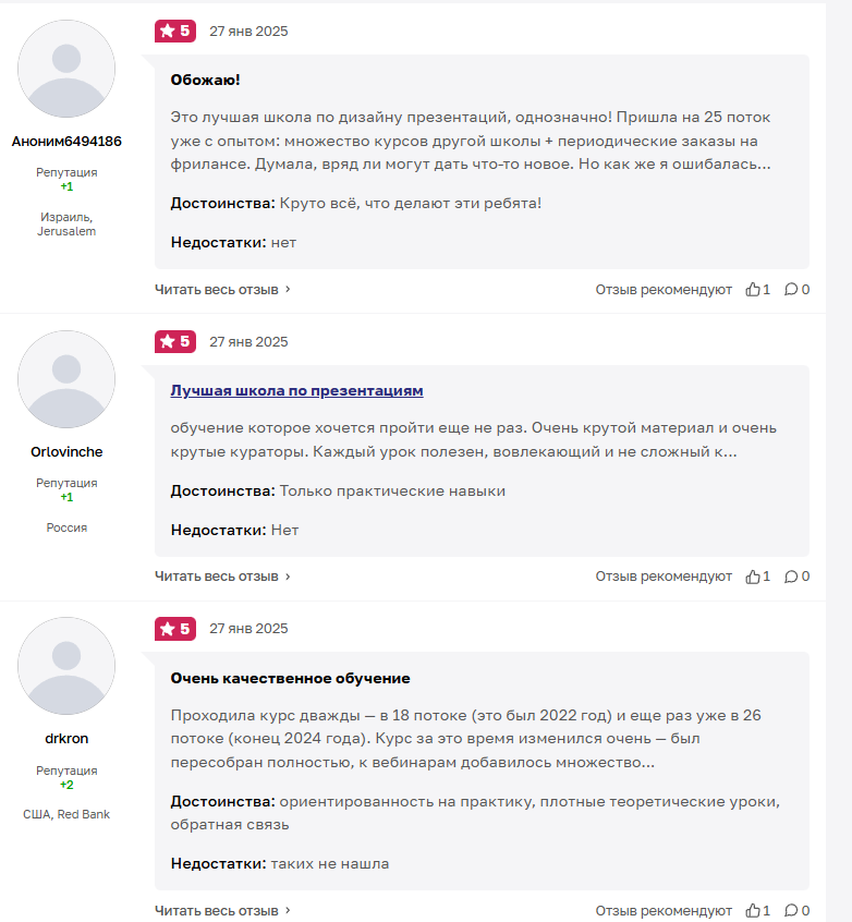 Отзывы о курсах по дизайну презентаций, которые преподает Ким Воронин, представлены на разных платформах. В основном об обучении отзываются с позитивом, но многие таки рецензии оставлены одним днем, что вызывает подозрения. Не исключена вероятность накрутки или того, что учеников стимулируют оставлять высокие оценки за некие бонусы.